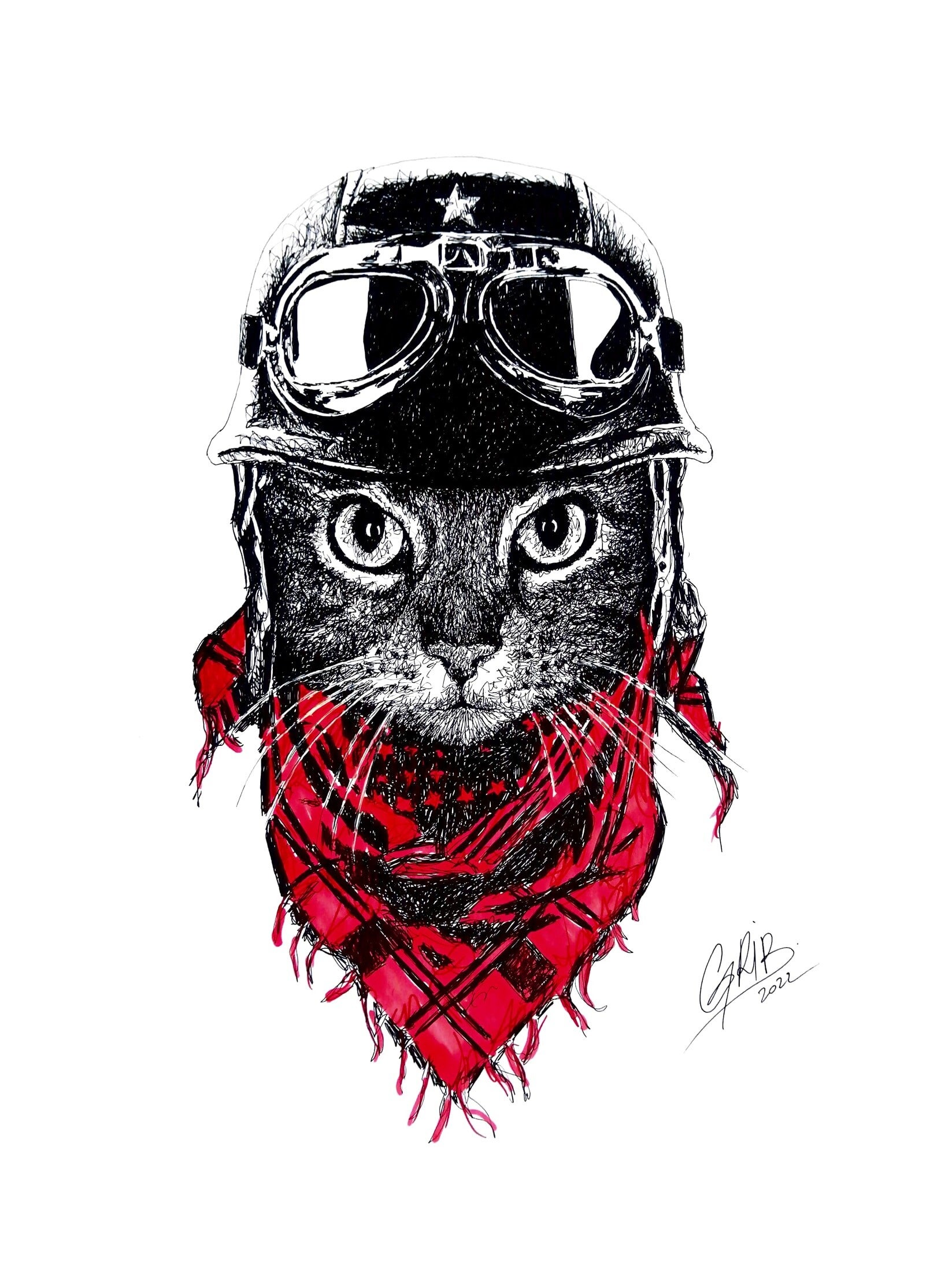 Cette œuvre en scribble art a été réalisée spécialement pour un groupe de motards des Pyrénées-Orientales. Le chat, symbole d’indépendance par excellence, incarne ici à merveille cet esprit libre tout en évoquant l’importance des liens d’amitié et de solidarité qui unissent le groupe.