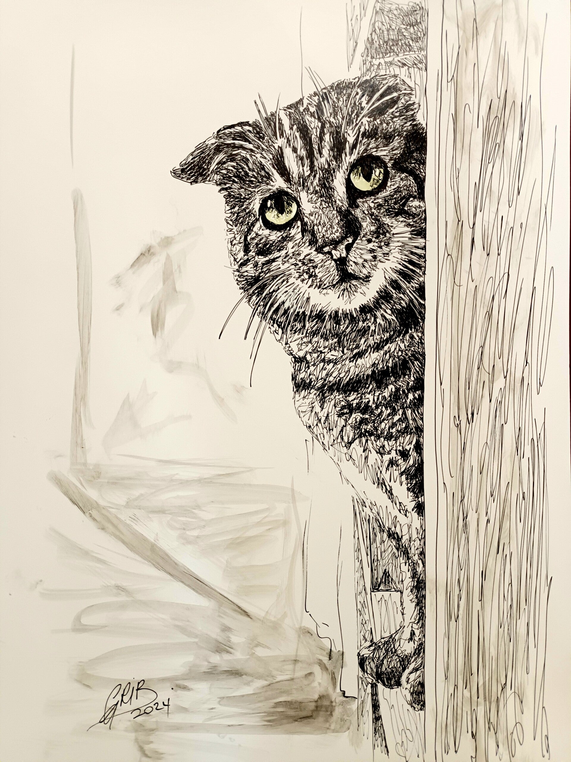 Dans cette œuvre de Scribble Art, un chat coquin se cache derrière une porte, créant une scène pleine de mystère et de malice. Les traits spontanés et fluides du Scribbling capturent l'instant d'attente du chat, dont la curiosité et l'espièglerie transparaissent dans les lignes entrelacées. Un jeu de lumière et d'ombre ajoute à l'atmosphère intrigante, mettant en valeur le caractère espiègle et secret de l'animal.
