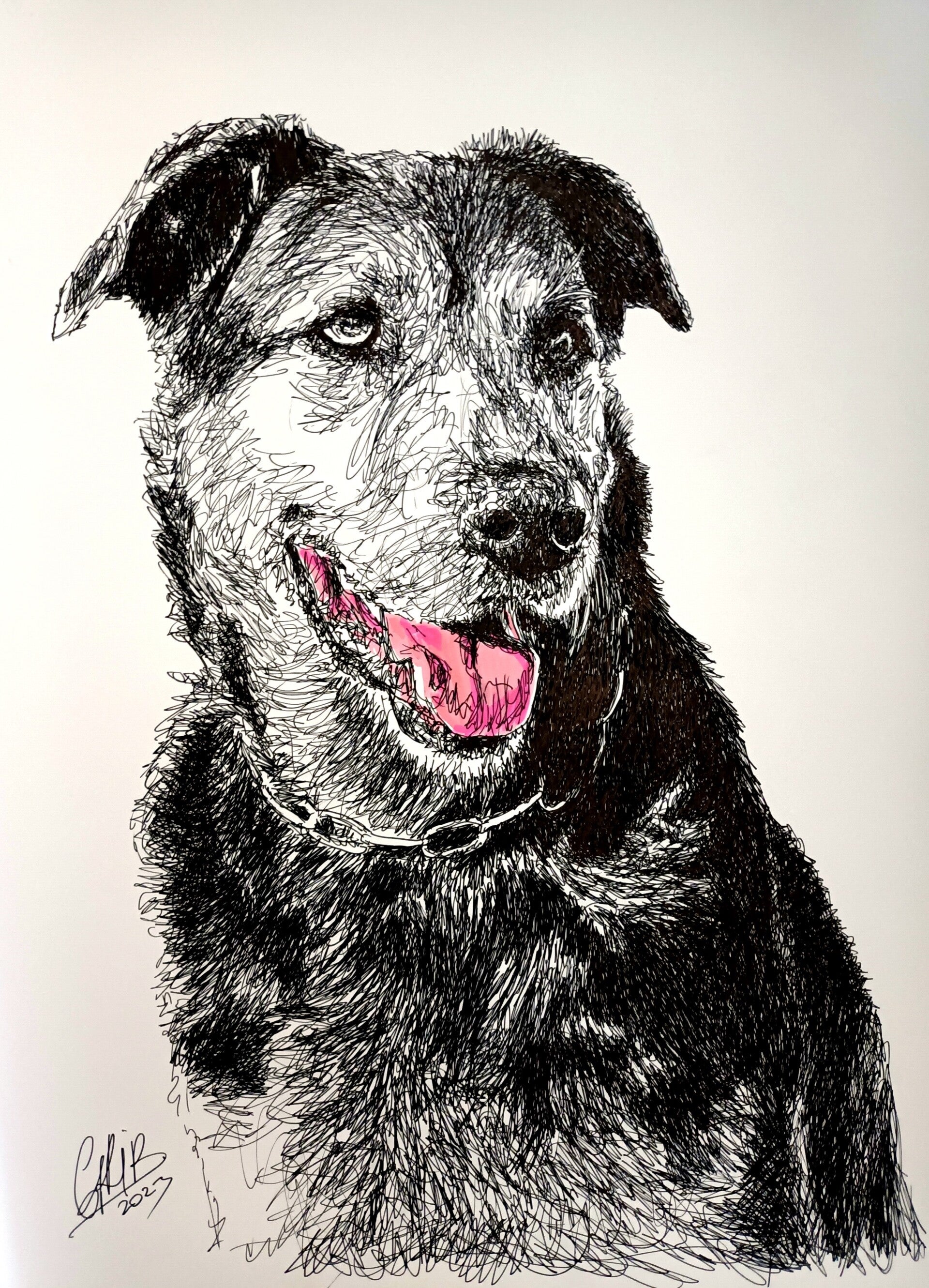 Ce portrait de grand chien noir capture la noblesse et la force de l’animal avec une grande expressivité. Réalisée en Scribble Art, cette œuvre mêle énergie brute et sensibilité, grâce à des traits entrelacés qui donnent vie à chaque détail du pelage et du regard.
